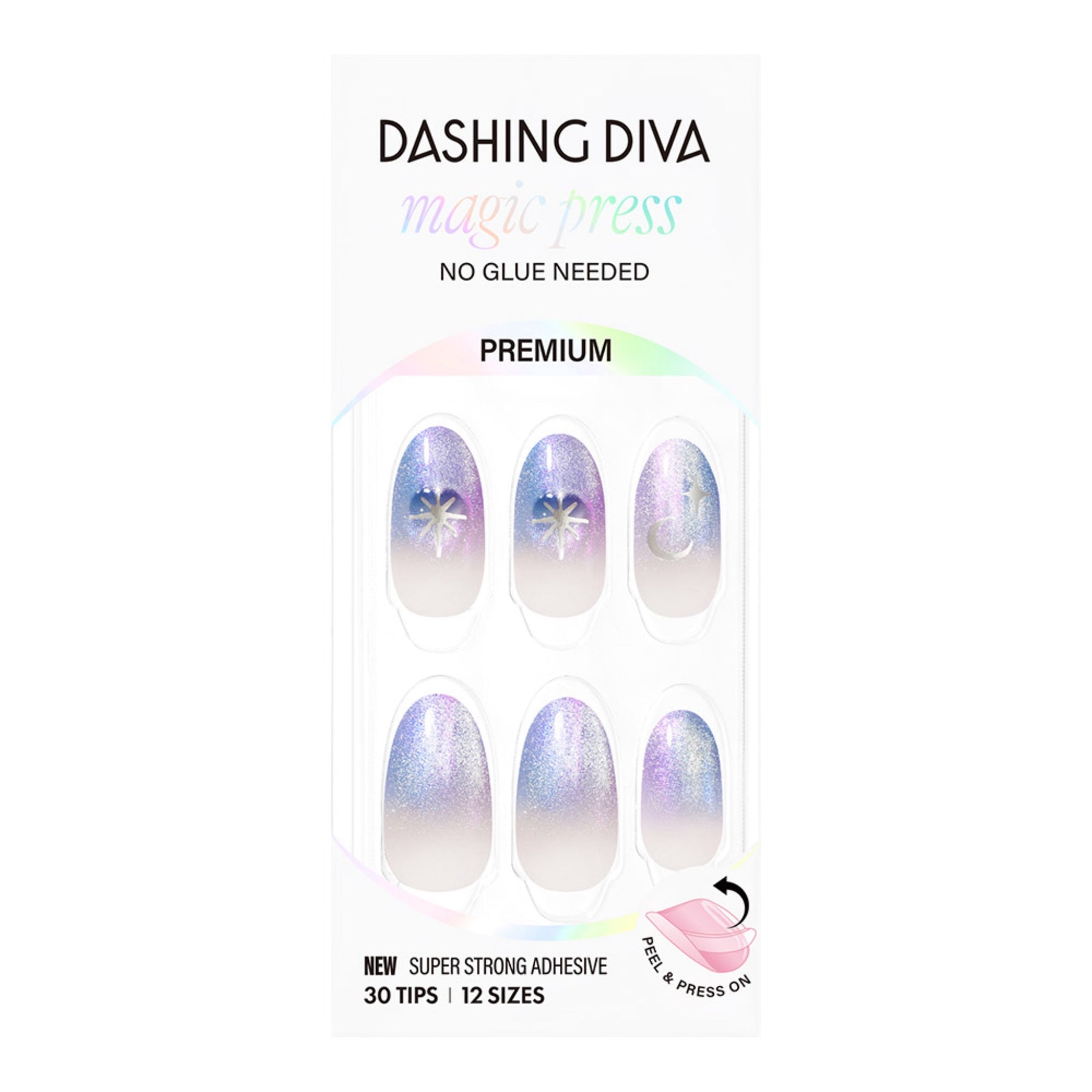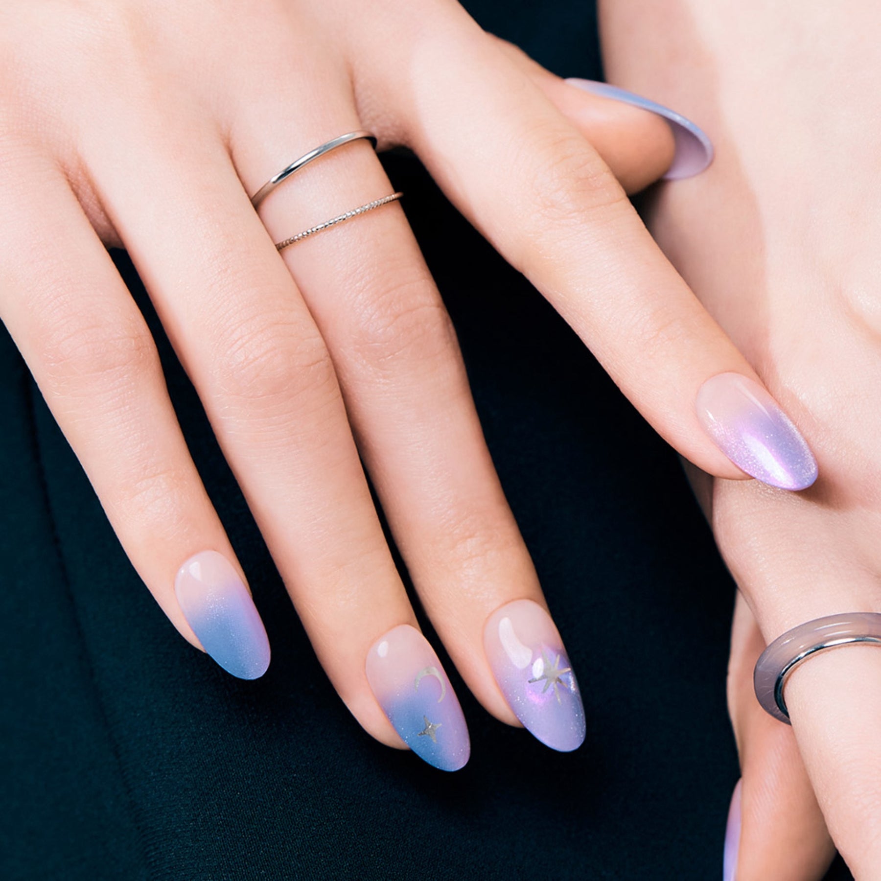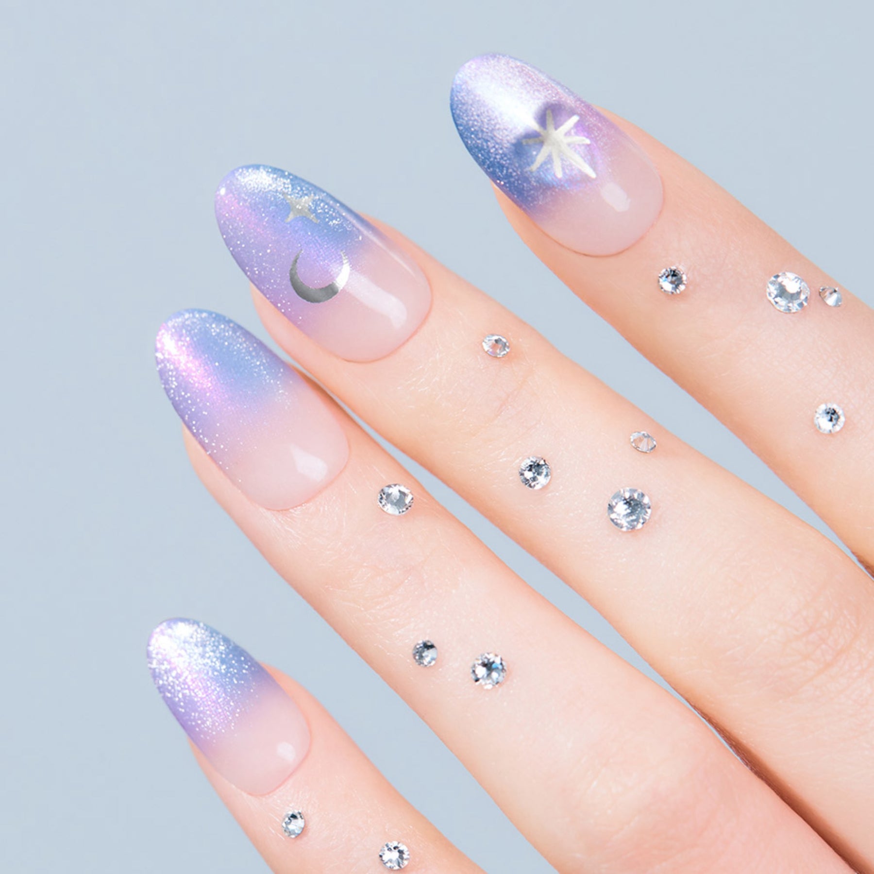 Shimmering blue and purple magnetic shades blend with silver accents and a clear heart, capturing the essence of a starlit night sky in this premium nail design.