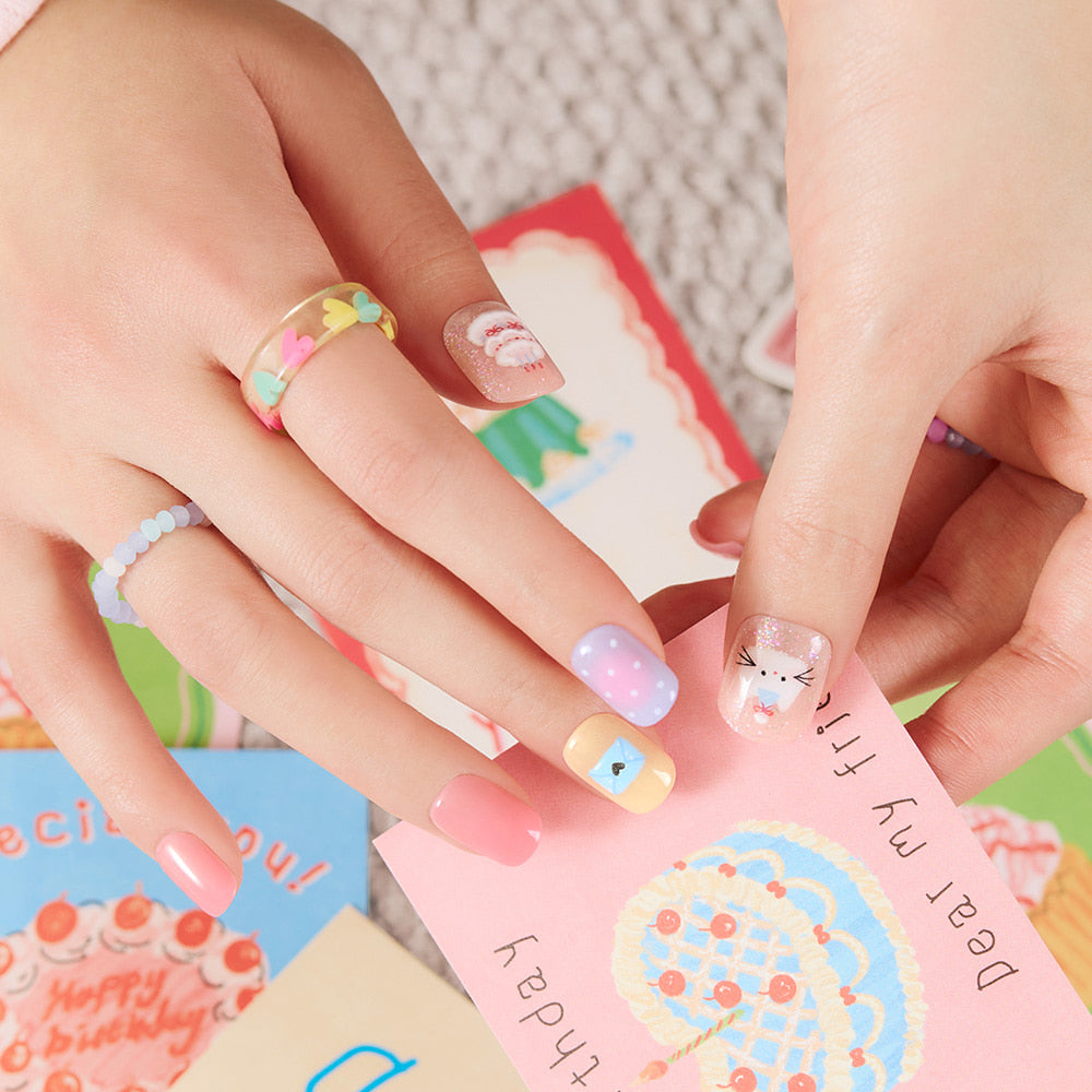 A lovely birthday nail design featuring charming doodle-style artwork and colourful accents to make your special day even more fun and festive.
